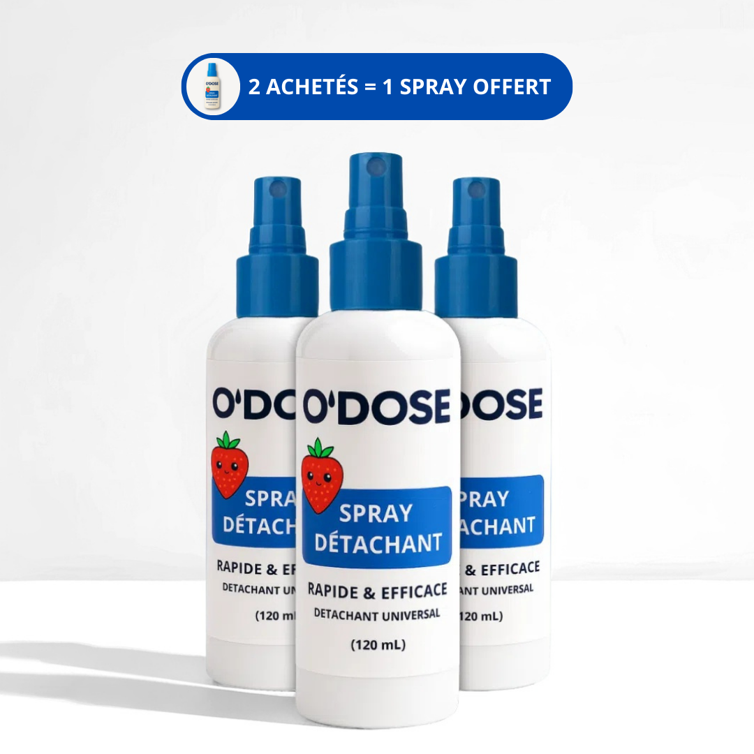 0'DOSE est un spray détachant pour environ +100 taches, prêt à l’emploi, qui agit dès l’application. Il élimine efficacement les taches de nourriture, graisse, sang, vin, herbe, chocolat, et bien plus encore… sur tous types de textiles : vêtements, draps, canapés, sièges auto...